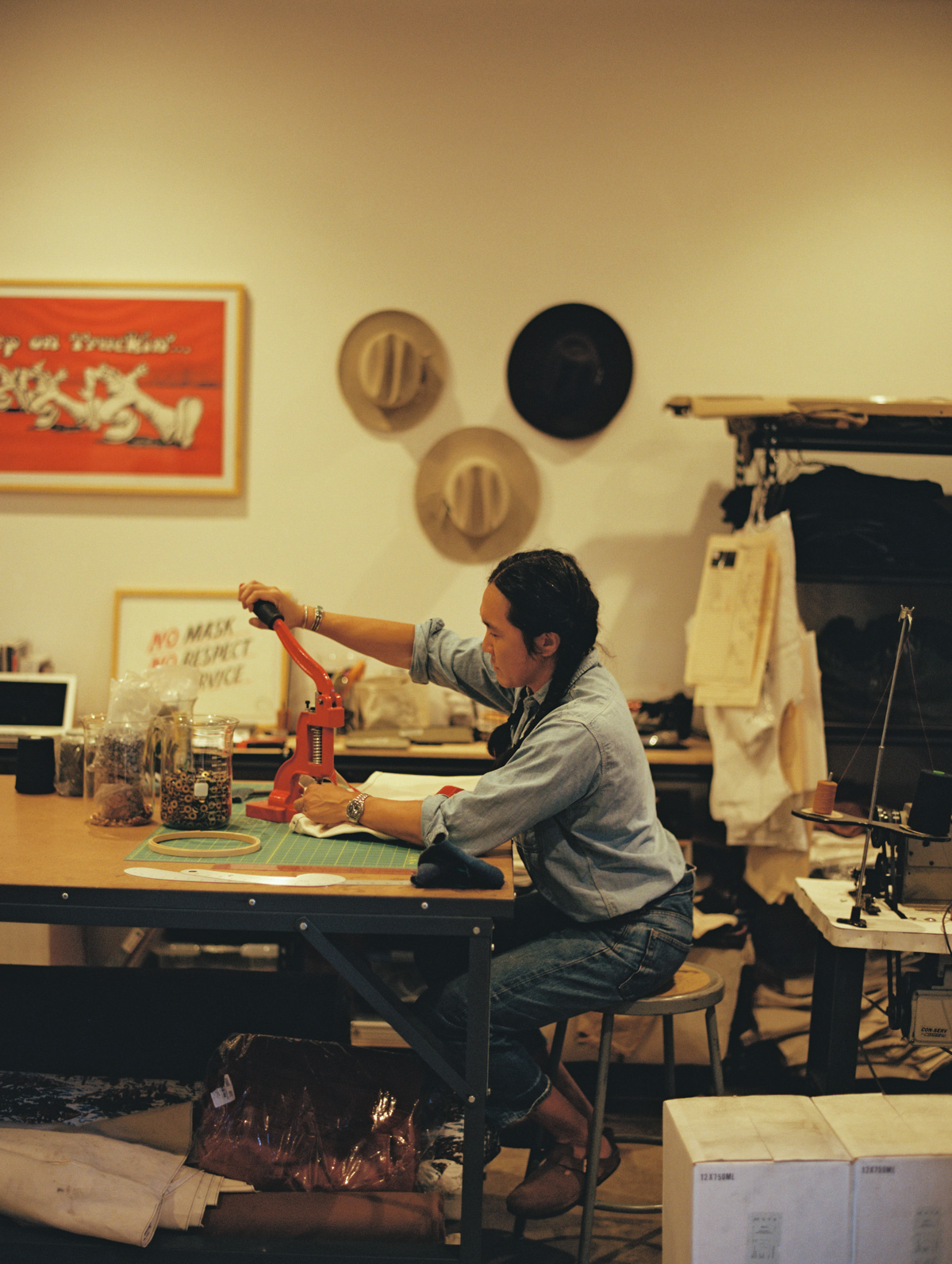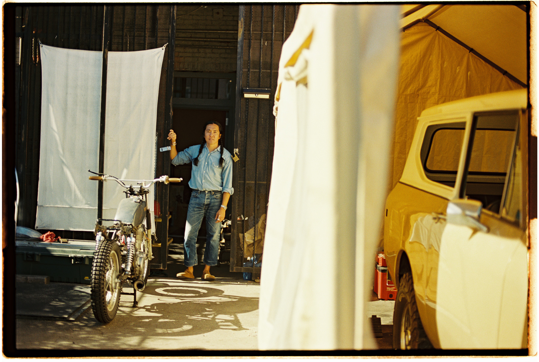 A treasure trove awaits: a well-worn World War II-era N1 deck jacket, stenciled with the name of its original owner. A mechanic’s coveralls from the 1950s. Touchingly tattered 1960s Hercules denim chore coats. A 1908 Midwestern farmhouse quilt. This meticulously crammed space is headquarters for Brian’s love of finding and collecting workwear, relics, and stories from the past. It also moonlights as his living space; a repair bench for patching up denim and doing custom fixes; a design studio for his personal collection; and a workshop for tinkering away at his other passion — fixing up old Yamaha motorcycles and classic trucks, including his 1977 International Harvester Scout II and 1978 Yamaha SR500. All told, the space feels part Petri dish and part creative incubator, an homage to specificity and honed obsession.