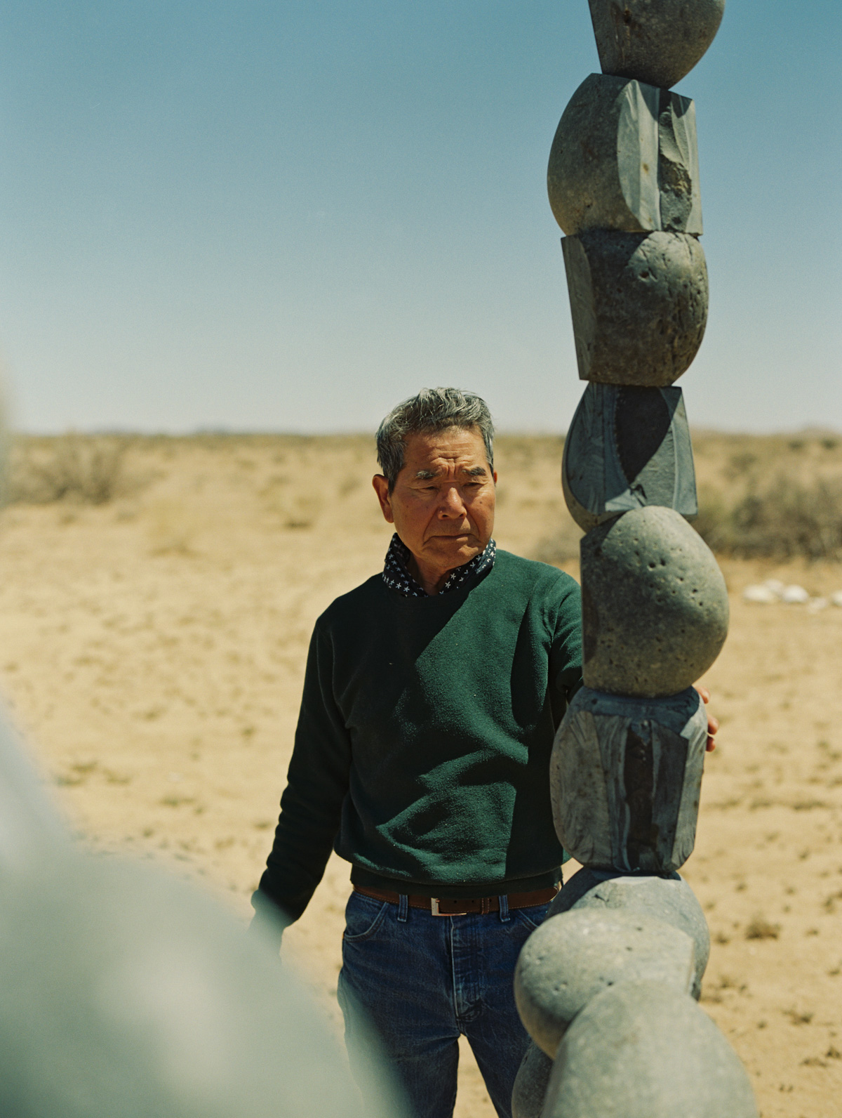 In the quiet Tehachapi ranchlands, Sakai’s working days are planned around feeding the horses and avoiding the direct heat of the sun, which lingers high in the early summer sky. The nuances of the desert have been constants in Sakai’s last decade, during which he’s focused on creating a series of permanent stone sculptures. From the Salton Sea to the Mojave, Sakai has moved from location to location — finding remote plots of land, taking up residence, then designing and installing a sculpture in the desolate landscape. When the work is complete, he moves on and does it all again. The desert works are unmarked and constructed anonymously, at once primitive in their materiality and conceptually experimental. Intentionally welcoming confusion and pause, they invite the viewer to ask what, why, how, and when…and purposefully evade a tidy answer.