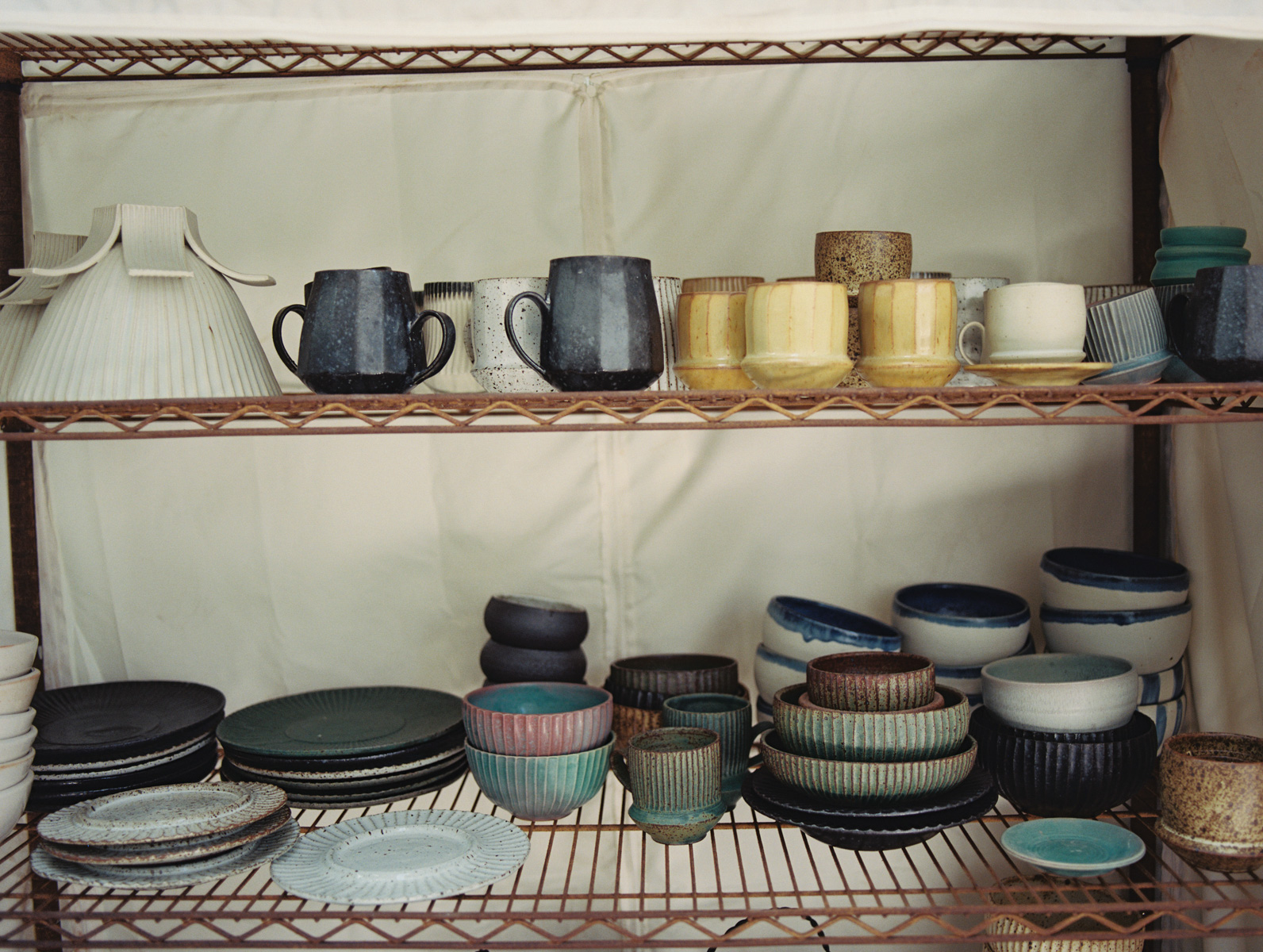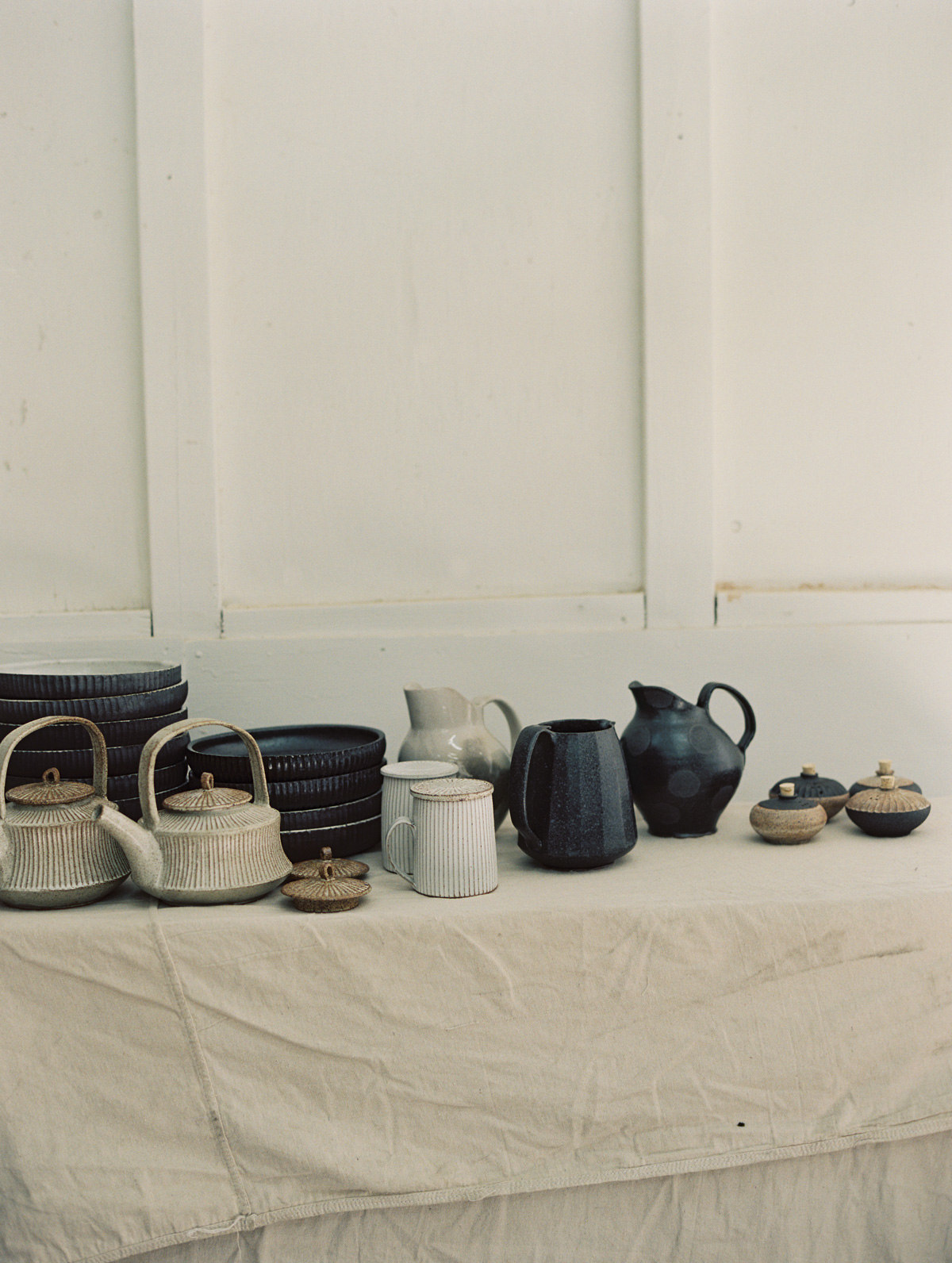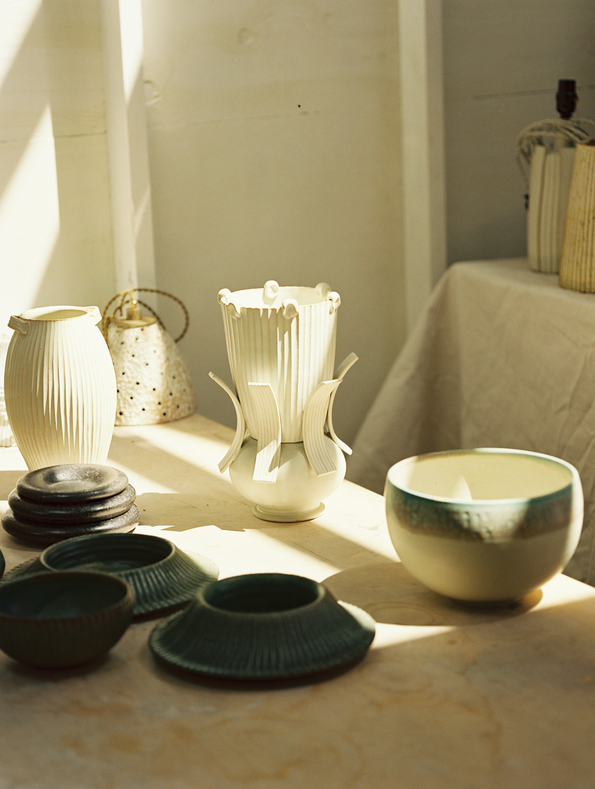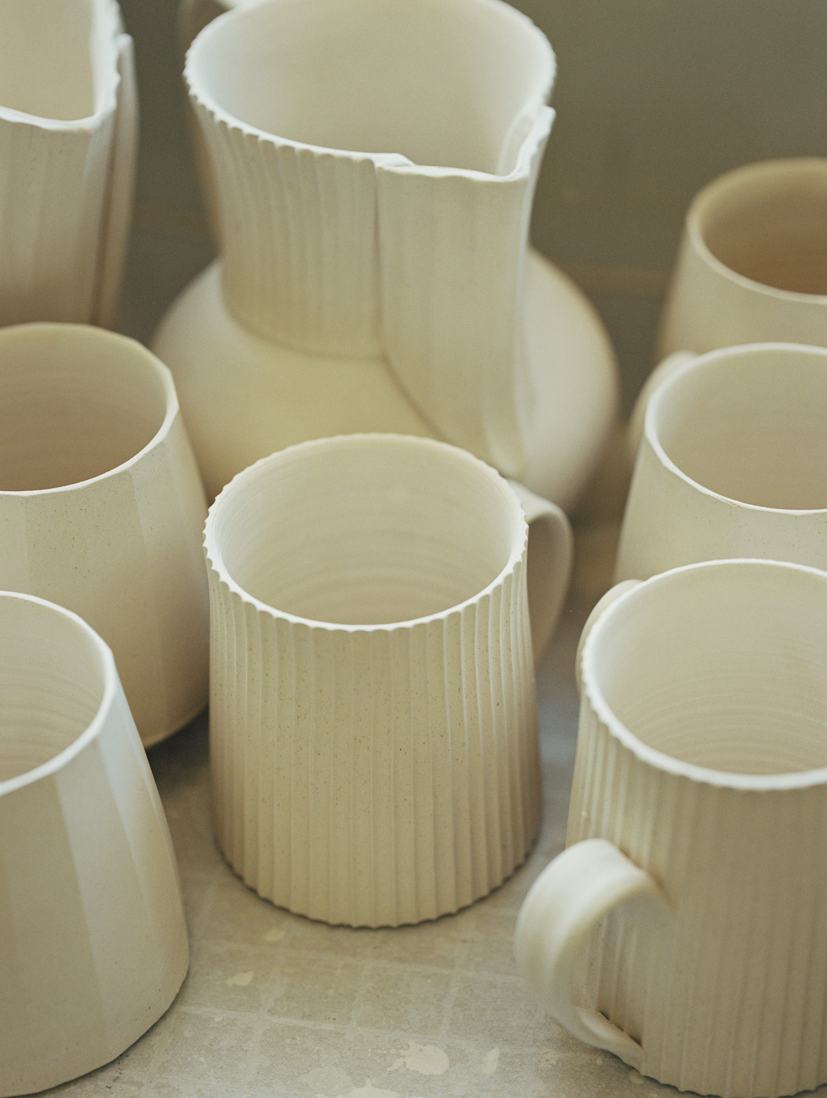 Fast forward a decade, where Zoe is now living in Sebastopol, and we meet on a sunny afternoon at the garage-turned-studio she’s renting (in the months since, she’s relocated her studio to a former dairy at the foot of Sonoma Mountain). Admiring the rows of freshly-glazed pieces that line her studio shelves, clear themes emerge in Zoe’s work: straight lines, milky white finishes, subtle speckling, textural details that recall the box pleats of a Victorian-era lampshade, moments of dimension and jettisoned form, a range of both the streamlined and the unexpected. Zoe’s pieces ask to be picked up, to hold their substantiality, to be interacted with. The work is neither precious nor inanimate; it feels alive. And while her approach has evolved slowly and organically through the years, it’s an ever-ebbing refinement that’s less reliant on strikes of inspiration and more about the repetition of practice. “I think the work is in continuing to show up and weather the storms,” she explains. “Even when — or especially when — it feels uncomfortable.”